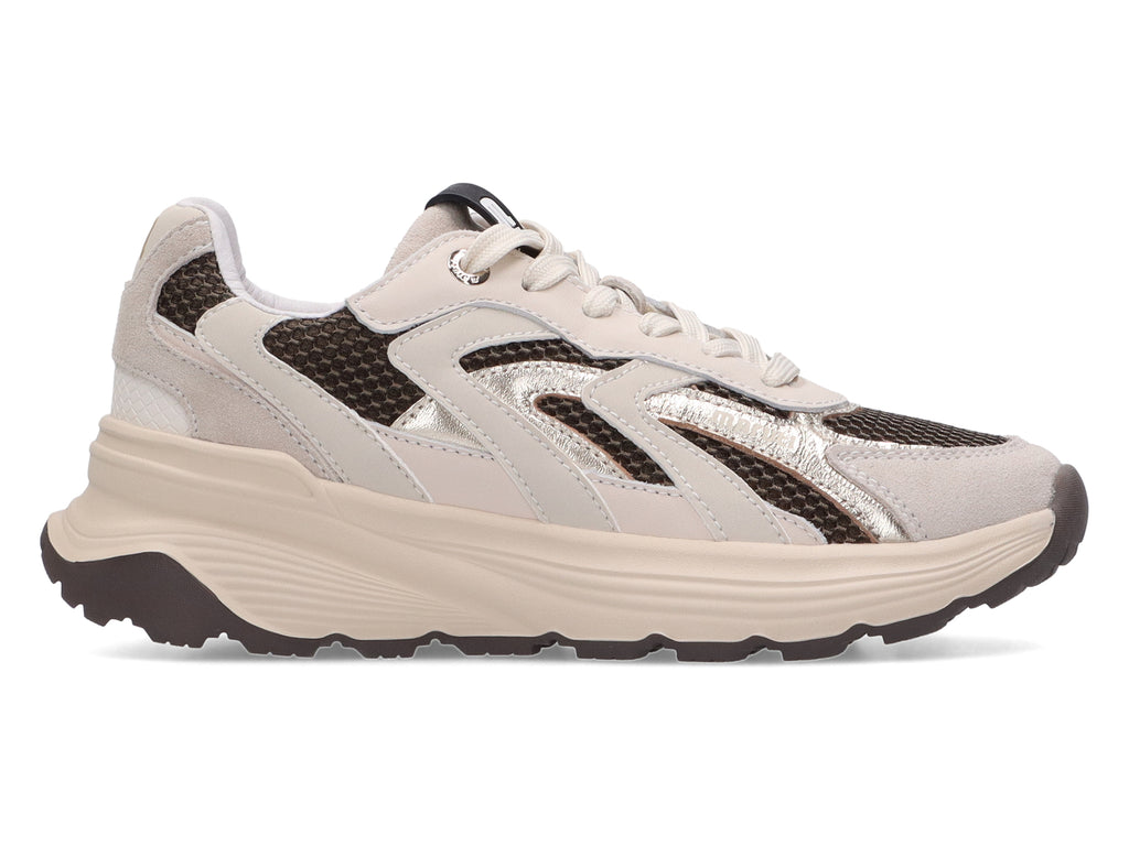 Make a statement this autumn with the Dora Sneakers Offwhite by Maruti. These chunky sneakers blend offwhite tones with shiny metallic accents and deep brown snakeprint details – a powerful mix of materials that’s perfect for the season. The layered design with wavy panels adds a dynamic touch, while the robust sole delivers maximum comfort on crisp autumn days. Style them effortlessly with straight-leg jeans, cropped trousers or a cosy knit. Ideal for those who want to combine comfort with character in a single sneaker.