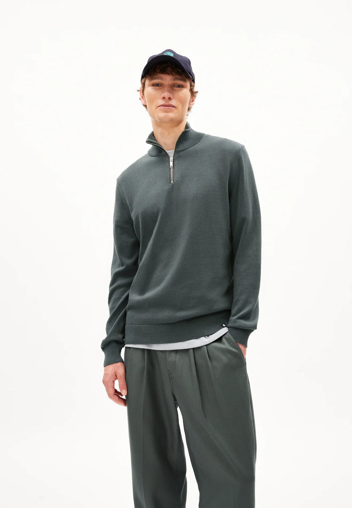 The FAABES pullover is crafted from organic cotton featuring a quarter zip design. It offers long sleeves, a high neck, and regular fit.