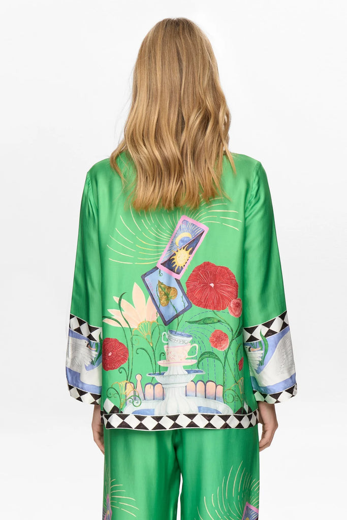 Silk feel shirt. Carrying on with the Wonderland theme this long sleeve shirt has a fabulous design on the back and around the cuff. Button closure.