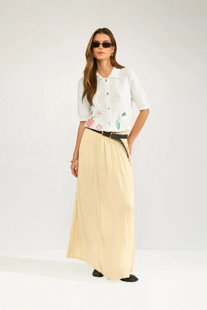 Designed with a classic collar and button-through front, this piece blends a polished silhouette with charming details. The delicate, ocean-inspired embroidery scattered across the front adds a whimsical touch, while the short sleeves and gently fitted shape keep it easy and versatile.