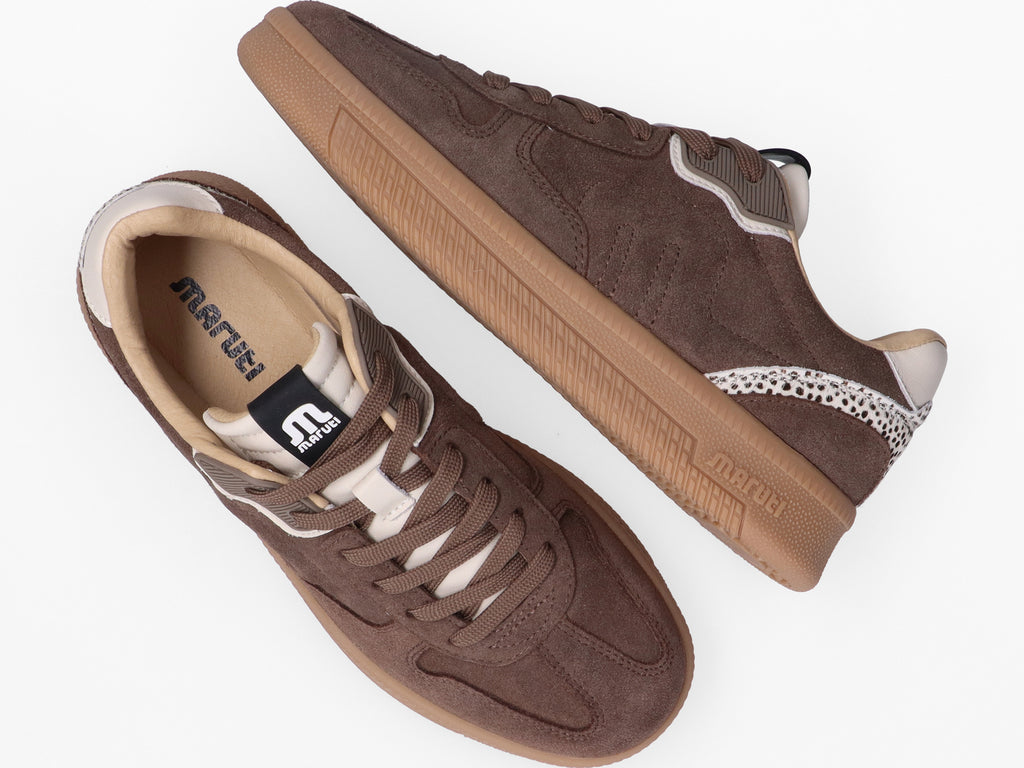 The Yale Sneakers Brown by Maruti are the foundation of a stylish autumn look. The warm suede-look material in deep brown gives this low-top sneaker a rich appearance, while the gum sole adds a sporty touch. Subtle details like the offwhite heel, ribbed lace panel and signature Maruti dot print complete the design. The soft lining and comfortable fit make this sneaker perfect for everyday wear. Pair the Yale with wool trousers, straight-leg jeans or an oversized knit for a timeless and relaxed autumn outfit.